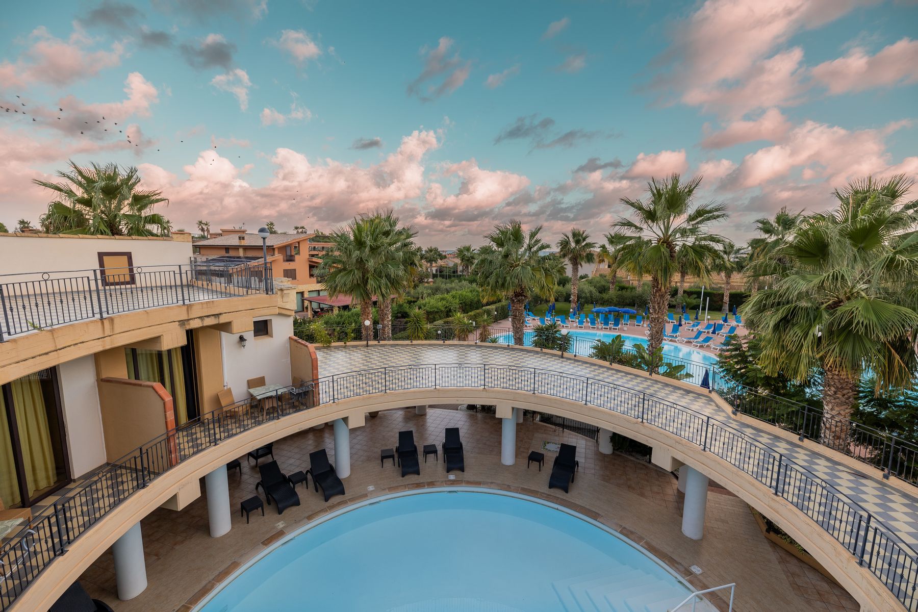 L’architettura esterna dell’Hotel prende ispirazione dai colori e dall’atmosfera della costa siciliana. Gli ampi spazi all’aperto si articolano intorno alle due piscine, le quali offrono un’ambientazione particolarmente suggestiva per eventi eleganti. Il richiamo all’atmosfera pittoresca degli antichi borghi siciliani si sposa perfettamente alla modernità delle attrezzature presenti e alla raffinatezza dei servizi.